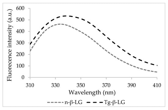 In its native state, β-LG exhibited maximum emission at a wavelength (λmax) of 334 nm, whereas when cross-linked, a significant 5 nm red-shift was found (Figure 1). The changes in the fluorescence properties of β-LG upon cross-linking suggest that the exposure and fluorescence of the Trp residues are affected by important molecular events mediated by Tgase.