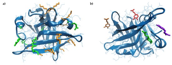 Three-dimensional model of the bovine β-lactoglobulin (4DQ3.pdb) [27] represented in a New Cartoon style. (a) Lys and Gln are represented in Licorice in orange and green, respectively. (b) Details on caffeic acid (CA) binding by β-lactoglobulin (β-LG) equilibrated at 25 °C—green, 75 °C—blue, 85 °C—ed and 95 °C—orange. The images are prepared using the Visual Molecular Dynamics software [31].