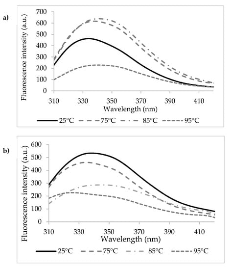 Heating the n-β-LG solutions caused significant redshifts of λmax from 334 nm at 25 °C to 339 nm at 75 °C, 342 nm at 85 °C, and 341 nm at 95 °C (Figure 3a). The 5–7 nm redshifts of λmax suggest that heating led to modifications in the polarity of the environment around Trp residues present in the β-LG chains. In particular, Trp19 became more exposed to the hydrophilic solvent as a result of heating. In agreement with Loveday [36], the temperature increase might have caused important conformational changes of the protein, potentially resulting in monomeric β-LG state and in the exposure of a hydrophobic patch and of the free thiol group of the Cys121. Advanced thermal treatment led to a second change in the monomer conformation, followed by the aggregation via covalent bonds mediated by Cys121 or non-covalent bonds (such as hydrophobic interactions). In addition to the thermal treatment, the protein concentration also influenced the mechanisms of denaturation and aggregation of whey proteins [37]. Iametti et al. [38] suggested that for the denaturation reactions in dilute protein solutions (concentration < 0.25%), the protein unfolding step was independent of the protein concentration, whereas the aggregation step was accelerated with increasing protein concentrations.
