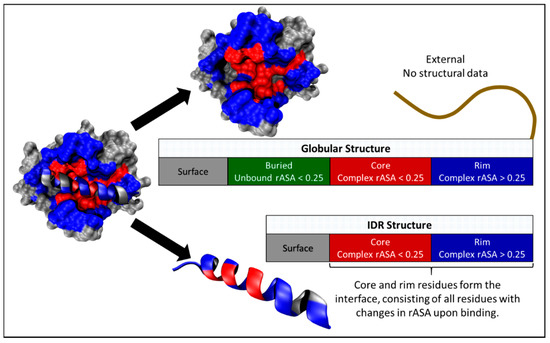 For each interaction pair, relative solvent accessible surface area (rASA) of protein residues were calculated to categorize the residues into protein regions. The SASA of each residue of the protein structures was normalized by the SASA of the residue type “X” calculated in a Gly-X-Gly peptide in extended conformation [9]. The residues were placed into structural categories based on their rASA in their bound and unbound states [9]. Surface and buried regions consist of residues above and below 0.25 rASA in the isolated protein chain, respectively. All residues with a change in rASA between the bound and unbound states were defined as interface residues. The interaction interface consists of the rim residues, which have rASA > 0.25 in the bound state, and the core residues, which have rASA < 0.25 in the bound state. Subsequently, the categorized residues were mapped to UniProt sequences [57]. Supplementary Figure S1 provides an overview of the construction process of the interaction structure datasets, as well as the number of structures and proteins involved. The dataset of globular interactions encompasses all interaction pairs, which is justifiable since the dataset of IDR interactions is small in comparison.