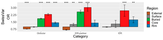 Odds ratios of SwissVar single nucleotide variants (SNVs). An odds ratio (OR) is calculated for each protein region using all residues in the dataset as the reference distribution. The bar graph plots the ORs (Y-axis) of each protein category and protein region (X-axis). Each OR is the odds of mutation in the specific region divided by the odds of the full-length parent proteins. The Y-axis is centered at one, and ORs > 1 show enrichment while ORs < 1 show depletion. Structural regions are color-coded (see Figure 1). Statistical significance is denoted by asterisks: * p-value < 0.05, ** p-value < 0.01, *** p-value < 0.001. ORs and p-values can be found in Supplementary Table S2.