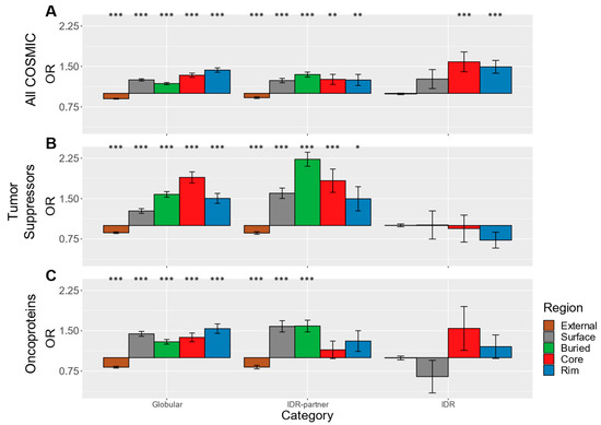 Odds ratios of COSMIC SNVs. (A) A bar graph of odds ratios of all COSMIC SNVs. The odds ratios of the subsets of proteins that were categorized as (B) tumor suppressors and (C) oncoproteins, respectively. See Figure 2 for details. p-values for all odds ratios can be found in Supplementary Table S2.