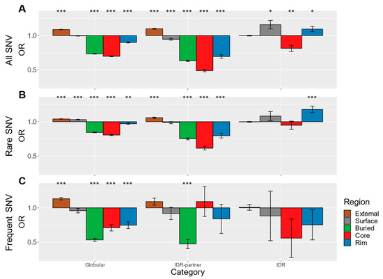 Finally, we analyzed missense mutations from gnomAD to investigate how mutations present in the general population are distributed across structural regions in globular, interacting IDR and IDR-partner proteins. The mutations from gnomAD (gnomAD SNV) are observed in a population of healthy individuals, so these missense mutations are typically not directly associated with diseases. David and Sternberg previously studied non-disease-associated missense mutations annotated in the UniProt database and showed that these variants are depleted from functionally critical protein regions [2]. Specifically, they revealed enrichment at the rim and surface regions and depletion at the buried and interface core regions. The gnomAD SNV data is from large-scale genome sequencing projects, which also allows the study of rare missense mutations that were previously not detectable. Thus, in addition to analyzing all gnomAD SNVs, we also analyzed subsets of gnomAD SNVs with frequencies from 5 * 10−6 to 10−6 (rare SNVs) and from 0.1 to 0.001 (high-frequency SNVs). Studies have suggested that some mutations with very low frequencies can have deleterious effects [23,64], so the high-frequency SNVs should more accurately reflect the localization of benign mutations.