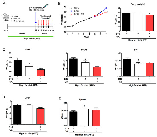 Effect of VA on obesity parameters in COC mice. (A) Experimental scheme of in vivo study. After HFD feeding of five weeks, mice (n = 15) were randomly divided into three groups. Then, 1 × 104 B16BL6 melanoma cells were injected subcutaneously into the right leg in two groups. Two days after tumor inoculation, VA (10 mg/kg/day) was administered orally for two weeks to one of the melanoma-injected groups. (B) Weekly change in body weight and final body weight were measured. (C) Adipose tissue (iWAT, eWAT, and BAT), (D) liver tissue, and (E) spleen tissue weight was measured. All data are expressed as mean ± SEM (n = 5); # p < 0.05 vs. HFD-fed control mice; * p < 0.05 and ** p < 0.01 vs. vehicle-treated COC mice. COC, cancer–obesity comorbidity; HFD, high-fat diet; VA, vanillic acid; iWAT, inguinal white adipose tissue; eWAT, epididymal white adipose tissue; BAT, brown adipose tissue; GAS, gastrocnemius muscle; TA, tibialis anterior muscle.