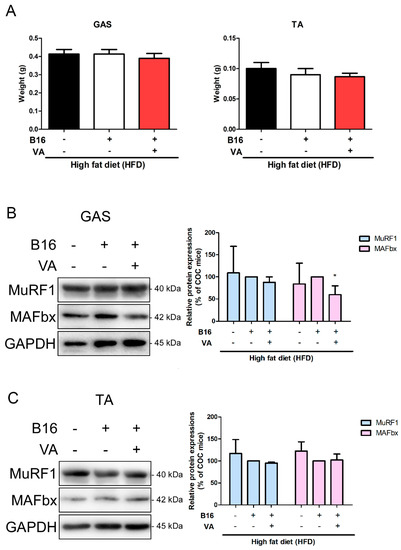 Since VA treatment reduced body weight and adipose tissue weight, we confirmed whether cachectic events were occurred. As shown in Figure 2A, tissue weight in two different muscles, gastrocnemius and tibialis anterior, did not differ from the non-cancer group or vehicle-treated COC group. The main mechanism of pathologic muscle decrease during cancer-associated cachexia is muscle atrophy caused by abnormal proteolysis [27]. When muscle proteolysis markers, including MuRF1 and MAFbx, were assessed by Western blot analysis, we could observe no significant alteration of these proteins in either of the muscle tissues (Figure 2B,C).