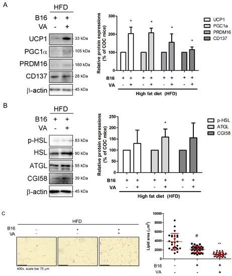 Effect of VA on iWAT of COC mice. (A) Protein levels of UCP1, PGC1α, PRDM16, and CD137 were analyzed by a Western blot analysis. Results were expressed relative to β-actin. (B) Protein levels of p-HSL, ATGL, and CGI58 were analyzed by a Western blot analysis. Results were expressed relative to β-actin, except p-HSL, which was normalized to total HSL. (C) H&E staining was performed in paraffin-embedded iWAT (magnification ×400, scale bar 75 μm), and average lipid droplet size was measured. All data are expressed as mean ± SEM (n = 3); # p < 0.05 vs. HFD-fed control mice; * p < 0.05 and ** p < 0.01 vs. vehicle-treated COC mice. COC, cancer–obesity comorbidity; HFD, high fat diet; VA, vanillic acid; iWAT, inguinal white adipose tissue.