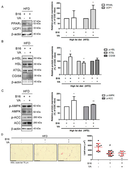 Since Wu et al. [62] reported beige adipocyte as a distinct type of adipocyte with the ability to dissipate heat like brown adipocytes, interest on therapeutic activation of beige adipocyte development has risen in the field of obesity. Trans-differentiated from traditional white adipocytes, beige adipocytes exert UCP1-mediated thermogenic action to consume accumulated lipid and produce heat [63]. In our results, factors from the thermogenic process, including UCP1, PGC1α, and PRDM16, were highly increased in iWAT of VA-treated mice, and their eWAT also showed a significant increase in UCP1 expression (Figure 3A and Figure 4A). Consistently, lipolysis was induced by VA treatment, as shown by increased related markers, such as HSL, ATGL, and CGI58 (Figure 3B). Moreover, AMPK, the key regulator of energy metabolism, was activated by VA administration (Figure 4C). The alteration in lipolysis and non-shivering thermogenesis led to a notable decrease in lipid droplet size within the WATs (Figure 3C and Figure 4D). These results showing that VA can increase thermogenic potential in white adipocytes fall in line with our previous study, in which we introduced the anti-obese effect of VA [24]. Based on the negative impact on melanoma aggressiveness caused from excess mass of adipose tissue, we herein conclude reduced melanoma size not only by controlling apoptosis and autophagy in cancer, but also by ameliorating obesity factors.