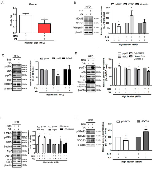 Effect of VA on allografted B16BL6 melanoma of COC mice. (A) Final weight of allografted B16BL6 melanoma tissue was measured. (B) Protein levels of MDM2, VEGF, and Vimentin were analyzed by a Western blot analysis. Results were expressed relative to β-actin. (C) Protein levels of p-JNK, p-p38, and COX-2 were analyzed by a Western blot analysis. Results of p-JNK and p-p38 were normalized to expressions of total JNK and p38, respectively. Result of COX-2 was expressed relative to β-actin. (D) Protein levels of p-p53, Bcl-2, BAX, and Caspase 3 were analyzed by a Western blot analysis. Results were expressed relative to β-actin. (E) Protein levels of p-MEK, p-ERK, Beclin-1, Atg7, Atg12, and LC3-I/II were analyzed by a Western blot analysis. Results were expressed relative to β-actin, except p-ERK, which was normalized total ERK. (F) Protein levels of p-STAT3 and SOCS3 were analyzed by a Western blot analysis. Results of p-STAT3 and SOCS3 were expressed relative to total STAT3 and β-actin, respectively. All data are expressed as mean ± SEM (n = 3); * p < 0.05 vs. vehicle-treated COC mice. COC, cancer–obesity comorbidity; HFD, high-fat diet; VA, vanillic acid; eWAT, epididymal white adipose tissue.