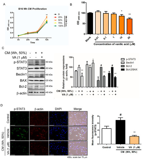 Effect of VA on adipocyte CM-treated B16BL6 melanoma cells. (A) The cell growth rate of B16BL6 melanoma according to the concentration (0%, 25%, 50%, 75%, and 100%) of CM diluted in complete medium was measured by an MTS assay. (B) Cytotoxicity of VA in B16BL6 melanoma was determined by an MTS assay. (C) Protein levels of p-STAT3, Beclin-1, BAX, and Bcl-2 were analyzed by a Western blot analysis. Results were expressed relative to β-actin, except p-STAT3, which was normalized to total STAT3. (D) Expression of intracellular p-STAT3 was evaluated by an immunofluorescence staining (magnification ×400, scale bar 75 μm). All data are expressed as mean ± SEM (n = 3); # p < 0.05 vs. untreated B16BL6 melanoma cells; * p < 0.05 and ** p < 0.01 vs. CM-treated B16BL6 melanoma cells. CM (Wh), white adipocyte conditioned media; VA, vanillic acid.