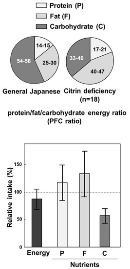 Figure 1. Peculiar food taste of citrin deficiency subjects. Upper panel shows protein, fat, and carbohydrate (PFC) energy ratio, and lower panel shows relative intake of nutrients of general Japanese and citrin deficiency subjects. From [53].