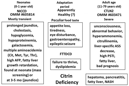 46. Ohura, T.; Kobayashi, K.; Tazawa, Y.; Abukawa, D.; Sakamoto, O.; Tsuchiya, S.; Saheki, T. Clinical pictures of 75 patients with neonatal intrahepatic cholestasis caused by citrin deficiency (NICCD). J. Inherit. Metab. Dis. 2007, 30, 139–144. [Google Scholar] [CrossRef] [PubMed]