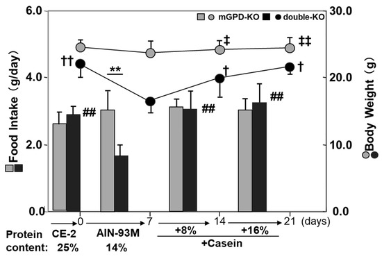 Figure 6. Intake of diet (high carbohydrate diet with defined composition, AIN-93M (recommended for mature rodent by American Institute for Nutrition in 1993) and body weight changes per week of mGPD-KO and double-KO mice and effect of supplementation of casein. The mice were usually given a high protein diet CE-2 (25%) from Clea Japan and changed the diet to AIN-93M (protein content is 14%), the intake is the average of a week and body weight changes in a week were monitored. Supplementation was done with reducing corn starch by the same amount. Differences in body weight for double-KO mice († p < 0.05, †† p < 0.01), and for mGPD-KO mice (‡ p < 0.05; ‡‡ p < 0.01) comparing the AIN-93M diet versus other supplementation were determined using a paired t-tests. Difference in food intake between diets within each genotype were determined using paired t-tests (# p < 0.01; ## p < 0.01) Difference in food intake between genotypes were determined using unpaired t-test (** p < 0.01) From [71].