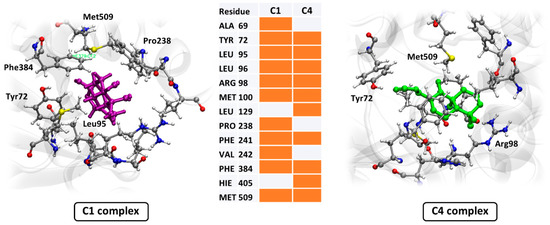 Trajectory analysis during the last 50 ns out of 150 ns MD runs was employed to identify the protein residues responsible for C1 and C4 association to 14-alpha demethylase, Figure 3. Our results revealed that both compounds exhibited similar interaction patterns with the LAN binding site with predominance of hydrophobic residues of the binding pocket. Common binding site residues are Tyr72, Leu95, Leu96, Arg98, Met100, Phe241, Phe384, and Met509.