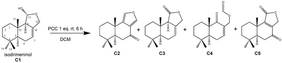The purification of the fraction F5 gave the drimane sesquiterpenoid isodrimeninol (C1) and the furofuran lignan sesamin. Oxidation of C1 with PCC furnished four products C2–C5. The structures of each compound are given in Scheme 1.