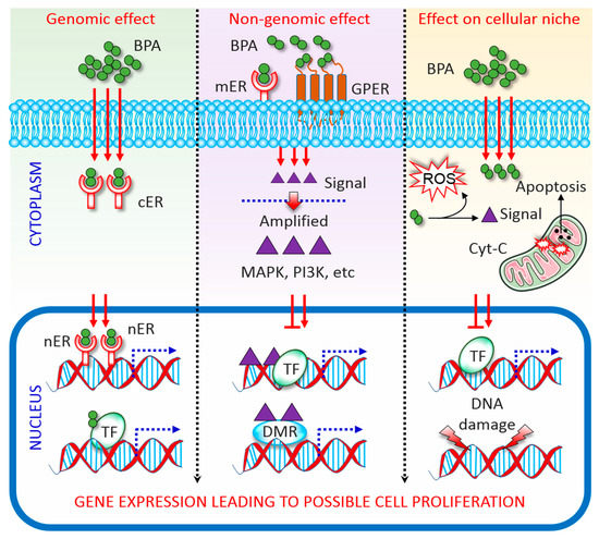Mechanisms of Bisphenol A (BPA) activity. Genomic, non-genomic, and direct effects exerted by BPA are depicted. See the main text for details. BPA, bisphenol A; DMR, differentially methylated regions; cER, cytoplasmic oestrogen receptor; Cyt-C, cytochrome c; GPCR, G protein-coupled receptor; MAPK, mitogen-activated protein kinase; mER, membrane-bound oestrogen receptor; nER, nuclear oestrogen receptor; PI3K, phosphatidylinositol 3-kinase; ROS, reactive oxygen species; TF, transcription factor.