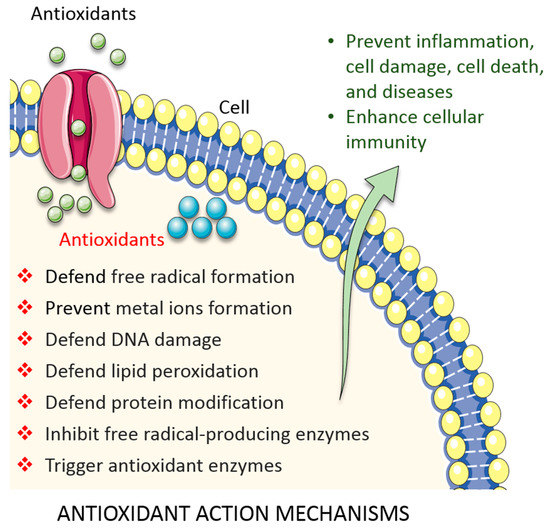 Antioxidants are broadly classified into two major groups, such as enzymatic and non-enzymatic antioxidants. Both enzymatic and non-enzymatic antioxidants are capable of regulating the free radical reactions, subsequently, restore cellular integrity. Enzymatic antioxidants (e.g., SOD, CAT, and GSH) capable of converting oxidized metabolic products in a stepwise process to H2O2 and later to the water with the help of cofactors [28,29,30]. On the other hand, non-enzymatic antioxidants interrupt and terminate free radical chain reactions [31,32,33]. Examples of non-enzymatic antioxidants include vitamin E, vitamin A, vitamin C, flavonoids, carotenoids, glutathione, melatonin, and so on [33].