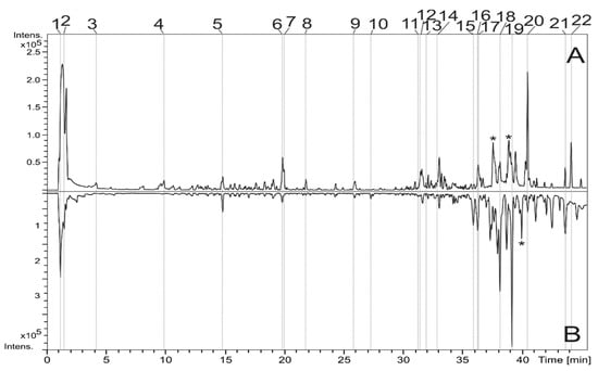 Figure 1. Total ion chromatograms from fruit pulp of D. alata (FPDA) obtained in the negative (A) and positive ion mode (B) (* peaks are not from the sample).