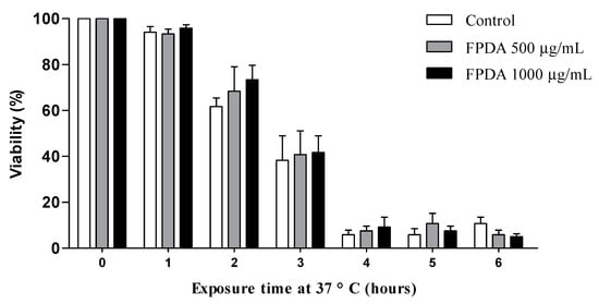 The antioxidant properties of FPDA were also evaluated in vivo. For this evaluation, the nematodes treated with FPDA during the egg phase until the L4 larval stage were subjected to heat stress, which is capable of promoting protein damage, at 37 °C for a maximum period of 6 h. In this assay, a protective effect of FPDA on nematode survival could not be observed (Figure 4).