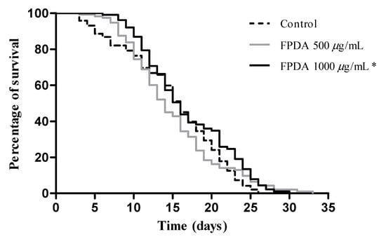 It has been reported that greater resistance to different stresses may be associated with an increased life expectancy. Therefore, we evaluated the effect of continuous treatment with FPDA on the lifespan of N2 nematodes. We observed that the nematodes treated with FPDA showed a longer lifespan (Figure 6). While the nematodes of the control group lived for a maximum period of 26 days, the nematodes treated with FPDA at a concentration of 500 μg/mL lived for 29.5 days, representing a 13.4% increase in the lifespan. The nematodes treated with a concentration of 1000 μg/mL lived for 29 days, which represented an increase in the lifespan of 11.4%.