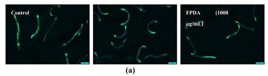 To evaluate the toxicity assay, on average 10 age-synchronized N2 nematodes were transferred to 96-well microplates containing M9 culture medium (100 μL) and FPDA (100 μL) at different concentrations (10 to 1000 μg/mL). Next, the nematodes were incubated at 20 °C for 24 and 48 h. As a negative control, the nematodes were incubated with only M9 culture medium (200 μL). After the incubation period, the nematode viability was assessed by sensitivity to touch using a platinum wire. The results of three independent assays performed in triplicate were averaged.