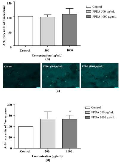 The transgenic strains CF1553 (muls84[pAD76(sod-3::GFP)]) and CL2166 (dvls19[pAF15(gst-4::GFP::NLS)]) were used to quantify the expression of the antioxidant enzymes superoxide dismutase (SOD-3) and glutathione transferase (GST-4). The nematodes were synchronized and treated with FPDA (500 and 1000 μg/mL) or only with the solvent (negative control). After 48 h, the treated nematodes were transferred to microscope slides (containing 1 mM levamisole as anesthetic), and the images were analyzed using an epifluorescence microscope (Nikon Eclipse 50i) connected to a digital camera (Samsung ST 64). Images of five nematodes from each group were taken, and the relative fluorescence of the entire body was determined using ImageJ software. Three independent assays were performed in triplicate.