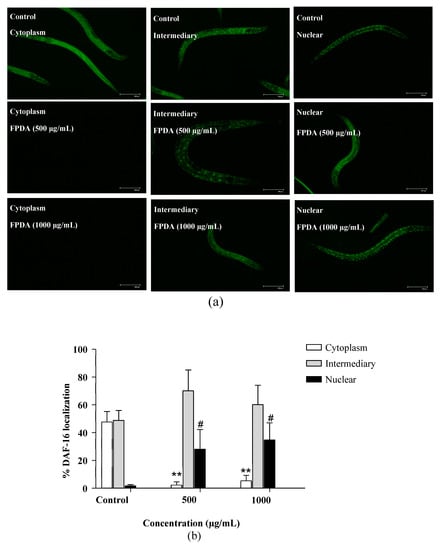 In the previous experiments, some possible targets involved in the antioxidant potential, resistance to stress, and lifespan regulation were investigated. FPDA stimulated the expression of the antioxidant enzyme SOD-3, which is a gene downstream of DAF-16; thus, the transcription factor DAF-16 was also investigated. In strain TJ356 (Figure 8A), which allows fluorescence visualization through its translocation to the nucleus, treatments with both 500 and 1000 μg/mL FPDA stimulated the nuclear translocation of DAF-16, representing approximately 16- and 21-fold increases compared to the control (Figure 8B).