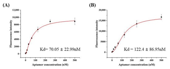 Characterization of aptamers via fluorescence quenching and recovery assay. (A) Binding affinity of HBA, Kd = 70.05 nM. (B) Binding affinity of HBA2, Kd = 122.4 nM.