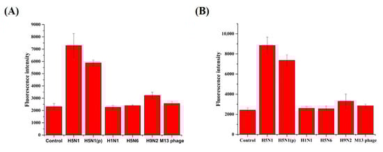 Specificity test for the selected aptamers. Each aptamer (HBA1 (A) and HBA2 (B)) specifically bound to H5N1 and H5N1(p), which was significantly greater specificity than for other virus subtypes (H1N1, H5N6, and H9N2) and non-influenza virus (M13 phage).