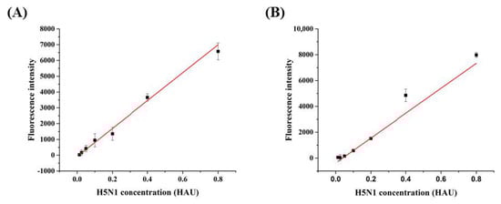 The detection limits of HBA1 and HBA2 were determined via H5N1 concentration-dependent fluorescence recovery. Fluorescence intensity recovered, along with an increase in H5N1 virus concentration. The detection curve was saturated at a high H5N1 concentration, and testing in the low range of H5N1 concentration was performed, to acquire a linear range of detection. According to the recovery signal, a linear graph for H5N1 was obtained in the range of 0–0.8 HAU, and the LOD for HBA1 and HBA2 was determined to be 0.08 and 0.1 HAU, respectively (Figure 3).