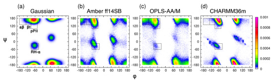 Another way to compare MD-derived Ramachandran distributions of guest residues to the Gaussian model counterparts is through the Shannon entropy associated with the distribution (see Section 2.2. for details). The difference between the Shannon entropy of each MD-derived and Gaussian Ramachandran distribution, , is reported in Table S3 (row 1) for each of the three MD force fields. The largest and positive value of is associated with OPLS-AA/M (), a smaller and positive is predicted by Amber ff14SB, whereas CHARMM36m displays the lowest and negative . A similar comparison for alanine in GAG (Table S3, row 2) using previously published Ramachandran distributions (see Table S2 in Zhang et al. [39]) reveals a similar trend: OPLS-AA/M predicts the largest value of (), followed by Amber ff14SB, whereas CHARMM36m is again associated with the smallest and negative . Notably, Amber ff14SB results in a significantly lower for alanine in GAG than for the central glycine in GGG, consistent with a much better performance of this force fields with respect to alanine conformational ensembles [39].