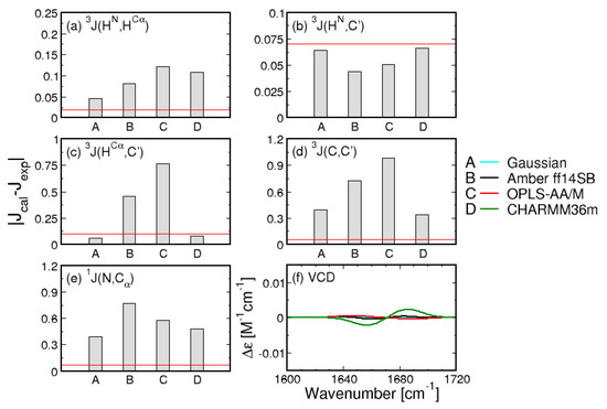Comparison between experimental and calculated J-coupling constants. (a–e) absolute differences between calculated and experimental values of the five J-coupling constants for the Gaussian model and the three MD force fields. Red lines correspond to experimental uncertainties; (f) amide I’ profiles calculated from MD-derived Ramachandran distributions.