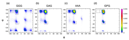 Tripeptides GGG, GAG, AAA, and GPG were constructed using the Visual Molecular Dynamics (VMD) software package [43]. A single tripeptide was immersed into a 64 nm cubic box with periodic boundary conditions at temperature 300 K using GROMACS 5.1.2 [44,45,46,47,48,49,50]. The following three combinations of force fields and water models were used: Amber ff14SB [37] with TIP3P [51], OPLS-AA/M [36] with TIP4P [51], and CHARMM36m [52,53,54,55] with TIP3P. In each simulation, the tripeptide under consideration was protonated at the N terminus (NH) and neutral at the C terminus to mimic acidic pH used in experiments. When using OPLS-AA/M and CHARMM36m, the C terminus was capped with a carboxyl group (COOH), whereas an amino group (CONH) capping of the C terminus was applied in Amber ff14SB. A single Cl ion was added to obtain an electrostatically neutral system. The Verlet cutoff scheme [56] and a time step of 2 fs were used during the equilibration and production steps. The steepest descent was utilized for energy minimization for 100,000 time steps, followed by a 20 ps pressure equilibration step at 300 K and 1.0 bar. Production runs using the velocity rescale thermostat [57] and Berendsen barostat [58] resulted in 300 ns-long trajectories. All Ramachanran distributions are calculated within GROMACS 5.1.2 using time frames (separated by ) within 50–300 ns of each MD trajectory. Additional simulations of GGG were performed with NH and COO cappings at the N and C termini, respectively, to determine the effects of end groups on the analysis. These simulations were prepared under the same protocol as mentioned above aside from the addition of ions, which is redundant as the peptide is neutral.