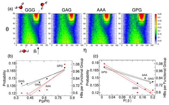 (a) Water orientation plots for hydration water adjacent to the backbone of the guest residue of GGG, GAG, AAA, and GPG. The leftmost plot shows three characteristic water orientations with respect to the normal to the SAS. The black rectangular region, defined in Section 2.2., contains the most populated water orientations. The color corresponds to the probability density (with scale values multiplied by 10). (b,c) The probability of the most populated water orientation (black solid circles) and the average number of water-guest residue HBs normalized by the number of functional groups (red solid squares) are shown as a function of the (b) pPII and (c) populations. The solid black and red lines in (b) are a result of a linear regression analysis with Pearson’s (the probability) and (the average number of HBs). The solid black and red lines in (c) show a result of the regression analysis with (the probability) and (the average number of HBs). Black and red dashed lines with error bars correspond to the regression analysis performed by using the shifted pPII and populations for the central glycine residue in GGG (black open circles and red open squares in b and c, respectively). The dashed black and red lines in (b) are associated with (the probability) and (the average number of HBs). The dashed black and red lines in (c) correspond to (probability) and (the average number of HBs).