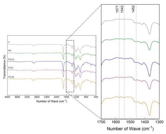 ATR-FTIR spectra of the cellulose acetate (CA)/polycaprolactone (PCL) microfibers unmodified (F) and modified with ampicillin, CLO, CO, and CJO (4000–400 cm−1). As the most significant for this study, the section between 1700–1300 cm−1 was amplified for a clearer detection of the peak’s characteristic of the immobilized biomolecules.
