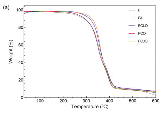 Degradation steps associated with temperature rise were recognized on the CA/PCL fibers via TGA and DTG (Figure 4). The first degradation step was identified at approximately 150 °C for the control samples (F) and between 220 and 240 °C for the remainder biomolecules. This indicates that the volatile nature of the EOs can be protected by being combined with polymeric matrices. Wen et al. reported just that by observing a shift in the first degradation step from ≈70 °C to ≈120 °C, when combining cinnamon oils with poly(vinyl alcohol) nanofilms [47]. Moreover, because of the reduced amount of EOs immobilized, the interactions established with the polymeric fibers may have left fewer free groups available, increasing the biomolecules’ stability and, consequently, their thermal resistance. This may also explain the differences in temperatures necessary to induce the first degradation step between the control samples (F) and the EO-treated samples. The incorporation of phenolic compounds (e.g., eugenol) within polymeric matrices has been reported to have a plasticizing effect that may shift the temperatures of degradation to higher levels [48]. This was particularly noticeable in the FCLO and FCJO. In the case of FCO, the relatively smaller diameters attained after modification (Section 3.4.2), which may have resulted from different intermolecular bonding, may also have narrowed the fiber’s thermal resistance.