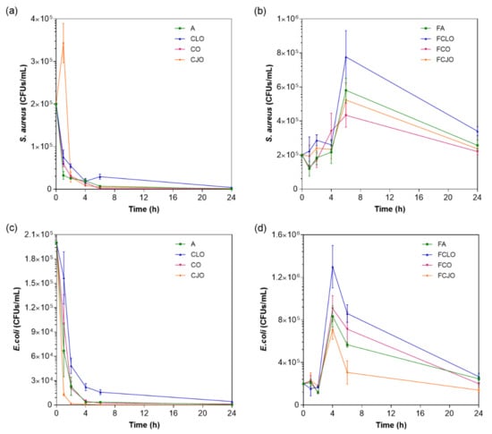The kill-time kinetics for each antimicrobial agent and loaded microfiber was determined by the number of remaining viable cells at specific incubation periods, 1, 2, 4, 6, and 24 h (Figure 5) and the associated log reduction (Figure 6). Data were compiled so the exposure/action time and the overall potency of the antibiotic and the EOs were established against both Gram-positive and Gram-negative bacteria free from antimicrobial agents or loaded fibers. For most of the free biomolecules, bacterial reduction was observed from the very first moments of contact. Indeed, after 2 h of incubation, ≈0.87 to ≈1.20 log reduction was verified against S. aureus and ≈0.97 to ≈2.48 log for E. coli, which represented an average decrease of ≈90% and ≈97% in the total number of viable cells, respectively. The continuous and progressive reduction in the number of viable bacteria and an increase in the log reduction values demonstrated the free agents’ effectiveness throughout time. Yet, there were no verifiable susceptibility patterns for each bacterium. For instance, CJO, which was present at the highest concentration, did not exert the quickest effect on the bacteria; in fact, in the first moments of interaction, CJO allowed S. aureus to grow. This inability to predict the behavior of an EO by its working concentration has been previously reported [5]. The only exception was CLO. Its bacterial response was the slowest from the group, which was proportional to the concentration in test. Regardless, after 24 h of incubation, bacteria treated with CLO experienced a reduction levels of ≈3.65 log for S. aureus and ≈3.55 log for E. coli, which were quite close to those registered by the other EOs. CLO may rely on the properties of its major component, eugenol, to affect the cells’ intracellular functions or ion transport, this way preventing important metabolites in the bacteria from working at full capacity and, ultimately, leading to the cell death [32]. Similar observations were made on the modified microfibers. Once again, FCLO displayed the lowest reduction levels, allowing bacteria to grow in the first 6 h. After that point, its action became more effective. It is likely that the intermolecular bonds generated during the 72 h immobilization period required more time to break, and consequently to allow the release of the EOs. The same growing patterns were observed for the other agents. However, their effectiveness in killing bacteria was superior to that of FCLO (Figure 6), as expected. There is yet to be a consensus on the period at which EOs are the most effective. However, it is generally accepted that they stimulate cell autolysis in exponential and stationary cell phases [50]. Our findings demonstrated that exponentially growing cells are very susceptible to the EOs’ action when in a free state, and that when immobilized their action tends to occur in a more stationary stage. Undeniably, log reduction was most significant after 24 h of culture. At this point, it was evident that S. aureus was more susceptible to the prolonged action of the EOs than the E. coli, the only exception being the CJO which was seen to act more effectively against the Gram-negative bacteria (Table 3).
