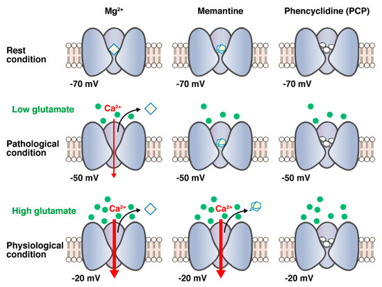 Parsons et al. reported that the blocking/unblocking kinetics of PCP and (+)MK-801 are too slow to allow them to leave the channel on depolarization, which may be attributed to the obviously weaker voltage dependency. As unblocking kinetics and voltage dependency are directly related to affinity, lower affinity NMDA receptor antagonists, such as memantine exhibit faster unblocking kinetics and obviously stronger voltage dependency. Parsons et al. also pointed out that, under physiological conditions, the NMDA receptors are transiently stimulated by millimolar concentrations of glutamate following strong depolarization of the postsynaptic membrane that rapidly removes Mg2+ from the binding site of the channel pore to relieve the voltage-dependent blockade caused by Mg2+. However, the voltage dependency of the divalent cation Mg2+ is highly prominent so that it easily leaves the NMDA channel even during moderate depolarization under pathological conditions, and NMDA receptors are stimulated by low concentrations of glutamate for a much longer period. Compounds with high affinities for NMDA receptors, such as PCP and (+)MK-801, have considerably slower unblocking kinetics than Mg2+ and are less functionally voltage-dependent. Therefore, the compounds cannot leave the channel within the time course of the normal excitatory postsynaptic potential mediated by NMDA receptors. Therefore, PCP and (+)MK-801 seem to block the physiological activation and pathological activation of NMDA receptors. Thus, the high-affinity and less voltage-dependent NMDA receptor antagonists, such as PCP and (+)MK-801, may induce unfavorable side effects. The voltage dependency of memantine is less functional than Mg2+, indicating that memantine can block only the activation of NMDA receptors during moderate depolarization under pathological conditions. Parsons et al. first proposed that the combination of fast off-rate kinetics and strong functional voltage dependency allows memantine to rapidly leave the NMDA channel during transient physiological activation by millimolar concentrations of synaptic glutamate, while it blocks the persistent activation by micromolar concentrations under the pathological conditions. Thus, memantine may display minimal side effects in clinical practice [50,51,54,55]. The schema of memantine for the hypothesis of blocking mode based on the combination of fast unblocking kinetics and strong functional voltage-dependency is represented in Figure 2.