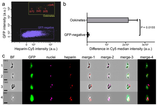 Heparin-Cy5 binding to ookinetes. (a) Flow cytometry plot showing heparin-Cy5 signal in green fluorescent protein (GFP)-expressing P. berghei ookinetes. GFP-negative events correspond mostly to red blood cells (see Figure S1 for gating strategy). c1 to c4 refer to the individual events reported in panel c. (b) Difference in Cy5 median intensity between GFP-expressing ookinetes and GFP-negative cells. (c) Fluorescence images of the flow cytometry events indicated in panel a. The merges of the bright field (BF) image with the fluorescence of heparin, nuclei, GFP, and all three of them, are indicated as merge-1 to merge-4, respectively. Size bars represent 7 µm.