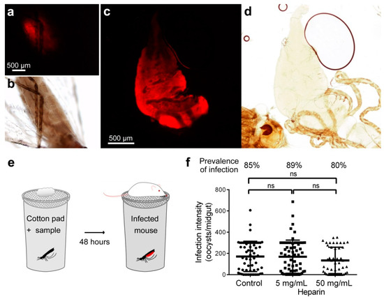 Effect on ookinete development of heparin fed to mosquitoes by sugar meal. (a,c) Fluorescence detection in (a) intact abdomen and (c) dissected midgut of heparin-Cy5 fed to A. stephensi female mosquitoes in a sugar meal. (b,d) Bright field images of the microscope fields in panels a and c, respectively. (e) Depiction of the method for sugar feed used in mosquito assays. (f) Effect on parasite development of heparin delivered by sugar swaps. ns: not significant.