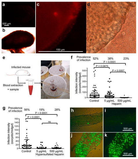 Effect on ookinete development of heparin fed to mosquitoes by membrane feeding assay (MFA). (a–d) Fluorescence detection of heparin-Cy5 fed to A. stephensi female mosquitoes by blood feed. (a,b) Whole dissected midgut and (c,d) magnification of the same midgut with the blood bolus pushed away. (b,d) Bright field images of the microscope fields in panels a and c, respectively. (e) Depiction of the MFA method used in mosquito assays. (f) Effect on parasite development of non-modified heparin delivered by MFA. (g) Effect on parasite development of hypersulfated heparin delivered by MFA. ns: not significant. (h–k) Fluorescence images of representative mosquito midguts from the MFA 500 µg/mL non-modified heparin group (h,i) and from the MFA control group (j,k); the fluorescence signal is shown alone (i,k) and merged with bright field images of the midgut contours (h,j).