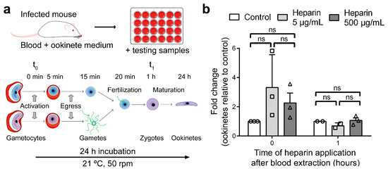 Effect of heparin in the ex vivo development of ookinetes. (a) Depiction of the method used for the ex vivo growth of ookinetes. The parasite development scheme has been adapted from Kuehn and Pradel [20]. (b) Effect of heparin on ex vivo ookinete maturation analyzed by flow cytometry (see Figure S4 and Table S1). ns: not significant.