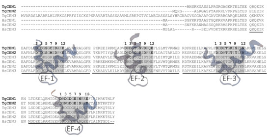 Figure 1. Multiple sequence alignments of TgCEN1 and TgCEN2 with other members of the centrin family. Residues critical for Ca2+ coordination (positions 1, 3, 5, 7, 9, and 12) in EF hands are shown in bold. TgCEN1 (T. gondii CEN1, UniProt: A0A125YHX7), TgCEN2 (T. gondii CEN2, UniProt: A0A125YZN2), TgCEN3 (T. gondii CEN3, UniProt: A0A125YXG1), HsCEN1 (H. sapiens CEN1, UniProt: Q12798), HsCEN2 (H. sapiens CEN2, UniProt: P41208), HsCEN3 (H. sapiens CEN3, UniProt: O15182). Sequences were aligned using Clustal Omega [34].