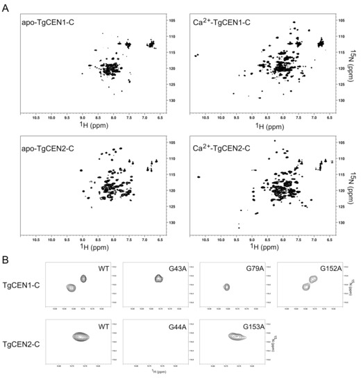 Figure 2. 1H-15N HSQC NMR spectra of TgCEN1-C and TgCEN2-C. (A) NMR spectra of apo- or Ca2+-bound 15N-labelled TgCEN1-C or TgCEN2-C. The apo-condition was obtained by adding 5 mM EGTA, while the Ca2+-bound condition was obtained by adding 5 mM CaCl2. (B) Downfield spectral region of 1H-15N HSQC spectra showing Gly-6 peaks of TgCEN1-C and TgCEN2-C variants in the presence of 5 mM CaCl2.