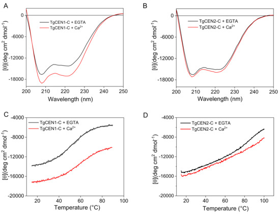 Figure 3. Far-UV CD spectra and thermal stability. (A,B) Far-UV CD spectra of 0.2 mg/mL TgCEN1-C (A) and TgCEN2-C (B) in the presence of 2 mM EGTA (black) and 2 mM CaCl2 (red). (C,D) Representative thermal denaturation profiles of TgCEN1-C (C) and TgCEN2-C (D) in the presence of 2 mM EGTA (black) and 2 mM CaCl2 (red).
