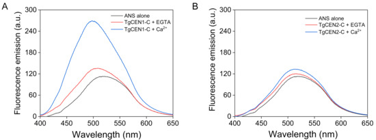 Figure 5. Fluorescence emission of ANS. Representative ANS fluorescence spectra of TgCEN1-C (A) and TgCEN2-C (B) in the presence of 2 mM EGTA (red) or 2 mM CaCl2 (blue). The spectra of ANS alone (black) is also shown.