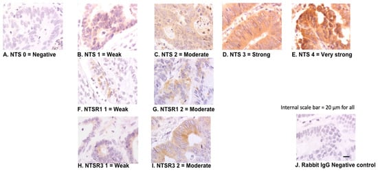 Figure 1. Peroxidase immunohistochemical staining for NTS: (A) negative, (B) weak signal, (C) moderate signal, (D) strong signal, (E) very strong signal. NTSR1: (F) weak signal, (G) moderate signal. NTSR3: (H) weak signal, (I) moderate signal. Rabbit IgG negative control (J). Internal scale bar = 20 µm for all.