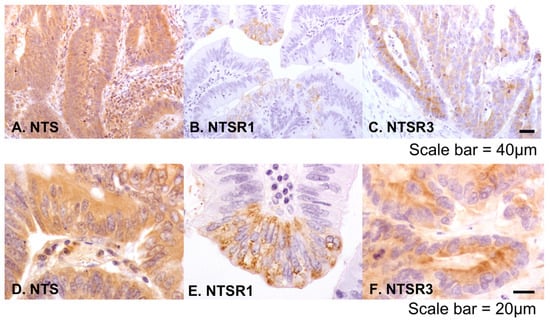 Figure 2. Low magnification peroxidase immunohistochemical staining of colorectal cancer tissue for NTS (A), NTSR1 (B), and NTSR3 (C) at 200 times magnification, internal scale bar = 40 μm. High magnification peroxidase immunohistochemical staining of colorectal cancer tissue of NTS (D), NTSR1 (E), and NTSR3 (F) at 630 times magnification, internal scale bar = 20 μm.