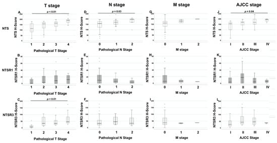 The H-score of NTS staining in cancer tissue was also significantly different between different N stages (p = 0.03, Independent samples Kruskal-Wallis test) and AJCC clinical stages (p = 0.04) (Figure 3D,J).