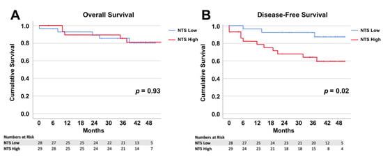 Figure 4. Kaplan Meiers curves of overall survival (OS) of subgroups with high and low expression of Neurotensin (NTS) in cancer (A), and disease-free survival (DFS) for subgroups with high and low expression of NTS in cancer (B).