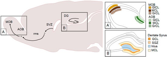 Traditional neurogenic brain regions including the subventricular zone (SVZ) system and the dentate gyrus (DG) of the hippocampus. A. Cells generated in the SVZ migrate along the rostral migratory stream (rms), pass the accessory olfactory bulb (AOB), and reach the main olfactory bulb (MOB). The MOB and AOB have the following three layers: glomerular cell layer (GlCL), molecular cell layer (MCL), and the granular cell layer (GrCL). B. The DG has various components including the granular cell layer (GCL), subgranular zone (SGZ), hilus, and molecular cell layer (MCL).